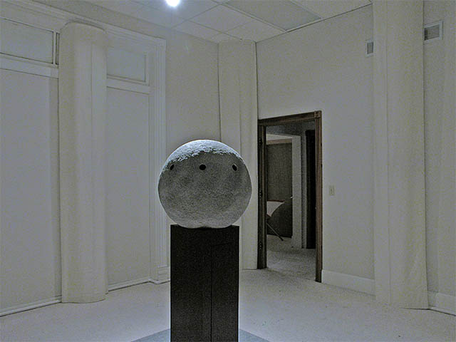 Eight sound environments are presented in random sequence, "beyond" the confining gallery room, with a long silence between them. They are heard through opening and closing doors. As each sound is cut off by a closing door, the listener's attention is thrown back into the silence of the present gallery space. At the center of the gallery space is a "dimensionless point," enlarged to macroscopic scale (a sphere about 24 inches in diameter) for easier viewing. The sphere has eight two-inch openings evenly spaced around it, pointing in the cardinal directions. Each opening in the sphere corresponds to one of the eight sound environments, each of which can be heard faintly inside the sphere (ongoing, uninterrupted by doors). Thus the external worlds are also internal; what is outside is inside. The observer is in the gap; he is the gap; he is the silence.